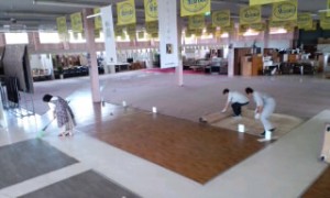 当店スタッフで古い床材を剥がした後は、 職人さん達による床張り作業です。 職人さん、有難うございます。